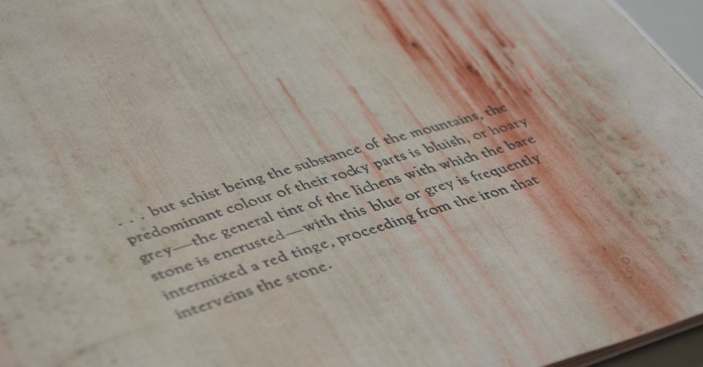Für das Künstlerbuch wurden zunächst alle Druckbogen von beiden Seiten mit Farben grundiert, die aus Erdpigmenten angerieben worden waren. Die Farbtöne nehmen die spätwinterliche Stimmung auf oder spiegeln den rostroten Farbton wider, der sich in den eisenhaltigen Kieseln der Bäche und Flüsse zeigt. Es sind fünf Holzschnitte als Illustrationen verwendet, einige davon auch mehrfarbig. Sie zeigen Szenen von den Wanderungen in den Regionen um Keswick und Derwentwater. Vier der Holzschnitte sind im Handabrieb gedruckt und nutzen ein spezielles Verfahren, bei dem ein oder mehrere Druckgänge auf die noch nicht vollständig getrocknete Druckfarbe des ersten Drucklaufes abgerieben werden. Bei diesem Verfahren wird jeder Abzug zum Unikat. Die Texte sind Passagen aus dem Buch „Guide to the Lakes“, das William Wordsworth im frühen 19 Jahrhundert geschrieben hatte – ein Klassiker der englischen Reiseliteratur.