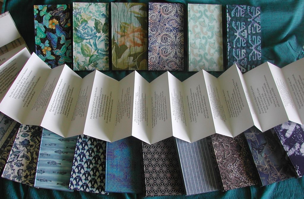 Für das Künstlerbuch habe ich die „Historie von der Schönen Lau“ umgeschrieben in ein Bänkellied mit 19 Strophen, zu singen nach der Melodie von „Sabinchen war ein Frauenzimmer“. Der Text selbst ist als Leporello gedruckt auf zartblaues Papier und fällt aus seinem Einband wie ein Schwall Wasser aus einer überlaufenden Quelle. Alle 16 Exemplare sind in blaugemusterte Stoffe gebunden – jeder Stoff wurde dabei nur für ein Exemplar verwendet. Das Bänkellied wurde zum Jubiläum aufgeführt: zusammen mit der Drehorgelfrau Ursula Groh und von der Gruppe „Soul to Swing“ im mehrstimmigen Gesang.