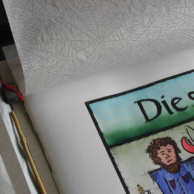 Zur Vorzugsausgabe des Künstlerbuches gehört eine Mappe, die neben der Moritatentafel auch das Künstlerplakat zum 10-jährigen Atelierjubiläum, einen Bambuszeigestock und ein „Klötzle Blei“ enthält.