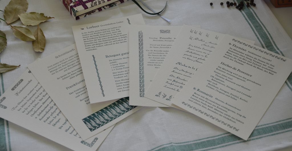 Und für alle, die noch die passende Briefkarte dazu legen möchten: Die Reihe „Bouquet garni“ besteht aus 6 Karten mit Kräuterrezepten. Es sind Klappkarten aus feinen Designerpapieren im Format A5 mit passenden Umschlägen.