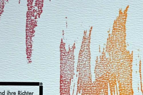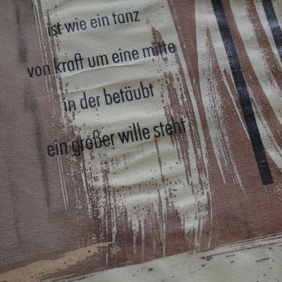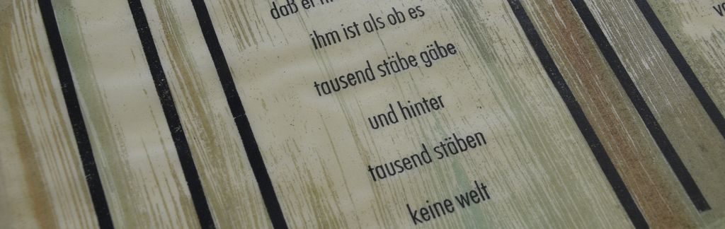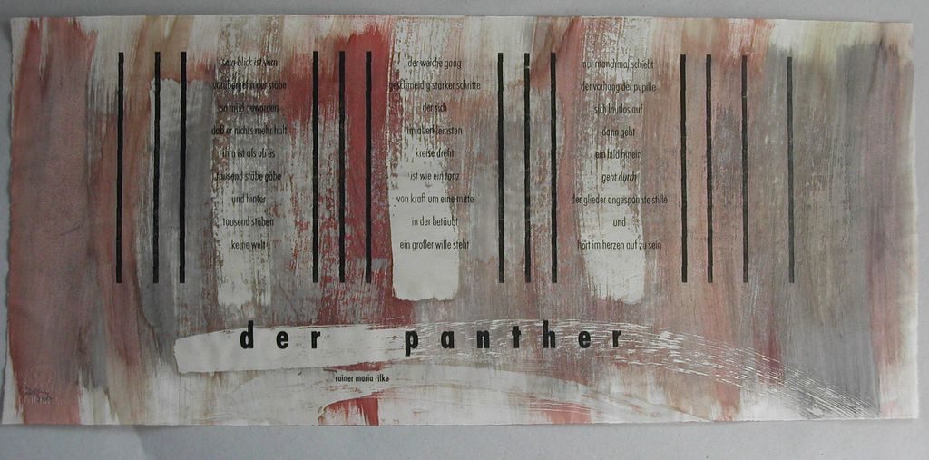 Das Gedicht „Der Panther“ gehört zu den bekannten Werken Rilkes. Hier ist es als großes Querformat in der Form des Einblattdruckes umgesetzt. Jeder Büttenbogen ist vor dem Druck von Hand individuell eingefärbt in einem Prozess ähnlich der Batik auf Stoff. Durch diese Art der Untermalung wird jedes Exemplar zum Unikat. Der Text ist von Hand gesetzt aus der Futura. Breite Messinglinien wurden verwendet zum Druck als Verweis auf die Gitterstäbe des Raubtierkäfigs. Das Blatt hat ein Format von 78 x 35 cm. Der Einblattdruck liegt in einer Auflage von 15 signierten Unikaten vor. Er ist erschienen im Jahr 2009. Preis 160,-