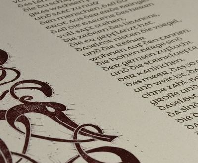 Das Gedicht „Der Panther“ gehört zu den bekannten Werken Rilkes. Hier ist es als großes Querformat in der Form des Einblattdruckes umgesetzt. Jeder Büttenbogen ist vor dem Druck von Hand individuell eingefärbt in einem Prozess ähnlich der Batik auf Stoff. Durch diese Art der Untermalung wird jedes Exemplar zum Unikat. Der Text ist von Hand gesetzt aus der Futura. Breite Messinglinien wurden verwendet zum Druck als Verweis auf die Gitterstäbe des Raubtierkäfigs. Das Blatt hat ein Format von 78 x 35 cm. Der Einblattdruck liegt in einer Auflage von 15 signierten Unikaten vor. Er ist erschienen im Jahr 2009. Preis 160,-