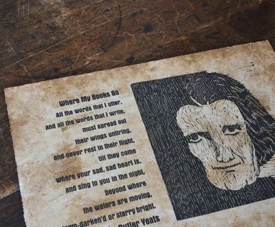 Scheerbarth und seiner Ballade bin ich begegnet im Zuge meiner Recherchen zum Bänkelgesang. Der Kosmos, Sterne oder ferne Planeten tauchen in Scheerbarths Werken immer wieder auf, so auch in dem Gedicht „Ingrimm“. Der Text ist für den Einblattdruck von Hand gesetzt aus der Schadow, entworfen von Georg Trump, im Hintergrund liegt ein Linoldruck. Gedruckt ist auf eine weiche, hellbraune Papierqualität. Der Einblattdruck hat ein Format von 41 x 62 cm und ist 2009 erschienen in einer Auflage von 16 nummerierten und signierten Exemplaren. Preis Euro 50,-