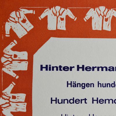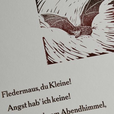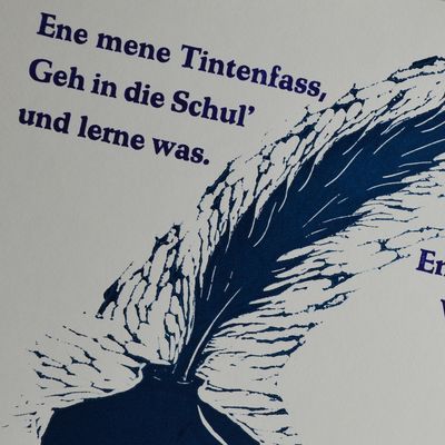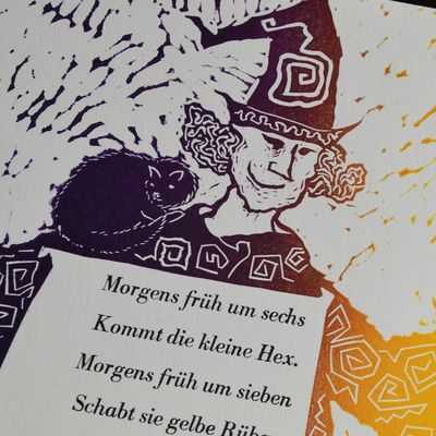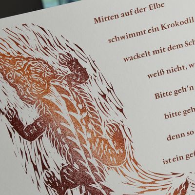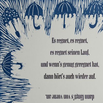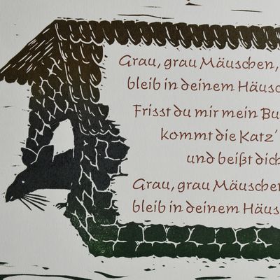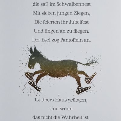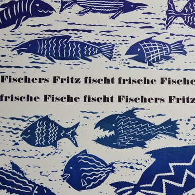 Die Blätter sind alle im Format 24 x 30 cm, also passend für dieses oder die größeren Standardrahmenformate. Sie können auch in ganz schlichte Wechselrahmen gesteckt und im Flur aufgehangen werden. So kann man immer beim Weggehen noch eben einen Vers zusammen lesen, und mit diesem Vers oder Zungenbrecher kann man dann unterwegs noch miteinander jede Menge Spaß haben. Die Texte sind von Hand aus verschiedenen Bleischriften gesetzt und für jeden Vers habe ich einen Linolschnitt angefertigt. Die Linolschnitte begleiten die Texte im farbenfrohen Irisdruck. Preis je Euro Blatt 12,50