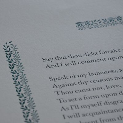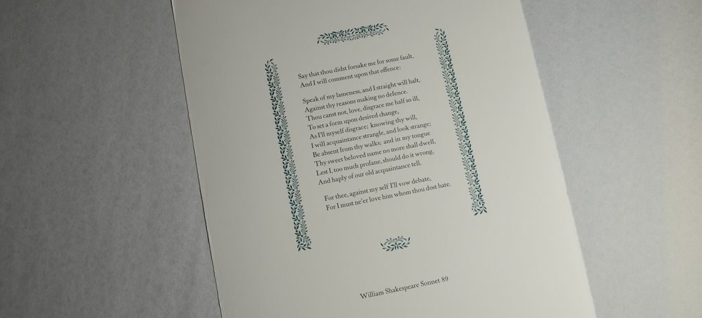 Version 2 ist gedruckt auf ein Zerkall-Rundsieb-Bütten (225g). Der Text ist von Hand gesetzt aus der Baskerville und im Schwarz gedruckt. Begleitet wird das Sonnet von einer zarten floralen Bordüre, die in Grün gedruckt ist. Der Einblattdruck ist 2016 erschienen in einer Auflage von 50 nummerierten und signierten Exemplaren. Preis 30,-