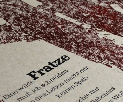 Version 1 ist gedruckt auf BFK-Rives Bütten (250g), ein Linoldruck ist in Rot in den Hintergrund gelegt und der Text ist von Hand gesetzt aus der Futura, komplett in Kleinbuchstaben und in Blau gedruckt. Der Einblattdruck ist 2016 erschienen in einer Auflage von 45 nummerierten und signierten Exemplaren. Preis Euro 30,-