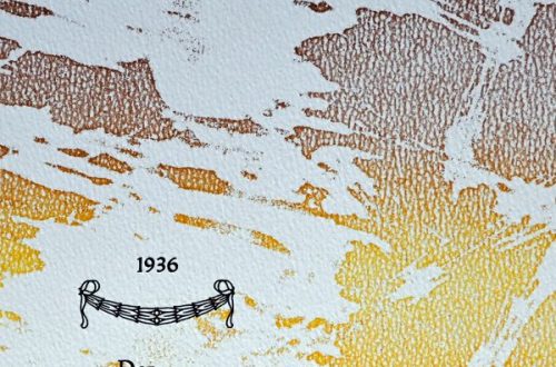 Die Mappe selbst ist im schlanken Format von 33 x 70 cm aus weichem Graukarton (Schrenz) gefertigt, mit einem Gelenk aus grünmeliertem Einbandgewebe und Gummibändern an den Ecken. Ein grüner Pfeilreiter gehört zum Lieferumfang dazu. Die Auflage besteht aus 13 nummerierten und signierten Exemplaren, erschienen im Krisenjahr 2009 – und heute so aktuell wie damals. Preis Euro 150,-