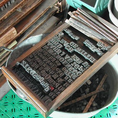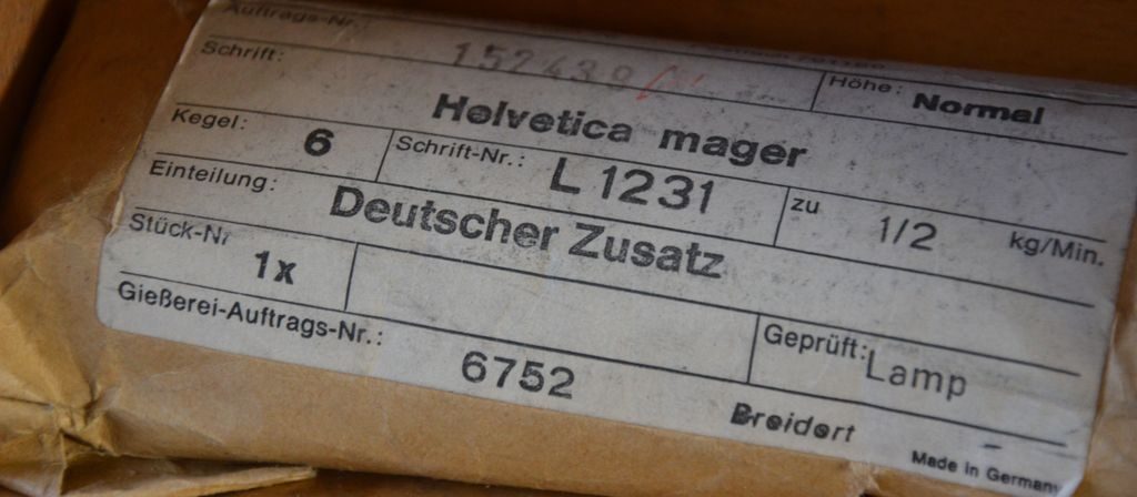 Andere Schriften kamen weit weniger spektakulär ins Atelier: von Buchdruckermeistern, die es nicht übers Herz gebracht hatten, das altgediente Material, das so viele Jahrzehnte das Auskommen des Betriebes gesichert hatte, zum Einschmelzen zu geben, und erleichtert waren, jemanden gefunden zu haben, der auch im 21. Jahrhundert noch mit den Schriften arbeitet. Aus Schuldruckereien, die aufgelöst werden mussten, um Raum für eine Mensa zu schaffen. Aus dem Nachlass eines Fotografen, der Ansichtspostkarten von Berggaststätten und Autogrammkarten von Schlagerstars der 1970-er Jahre gedruckt hatte. Manchmal war Schrift auch bereits im Eimer, will heißen in die Zinkwanne gekippt worden und musste mühselig wieder heraussortiert werden. In diesem speziellen Fall wurde auch die alte Zinkwanne in den Bestand des Ateliers übernommen.