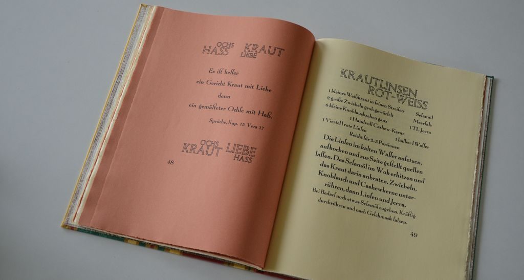 Das erste Projekt, in dem eine Vielzahl meiner Schriften zum Einsatz kam, war das Künstlerbuch mit dem Titel „Annettes und Günters fernöstliches Schmausbuch“. Es ist im Jahr 2002 erschienen und längst vergriffen. Das Buch ist eine philosophisch-typographische Rezeptesammlung. 22 Rezepte im asiatischen Stil sind mit Aphorismen und kleinen Geschichten aus der Philosophie (überwiegend aus dem fernen Osten) kombiniert, wobei die Sentenzen und Anekdoten alle in irgendeiner Weise sich mit dem Essen oder Kochen befassen. Gedruckt sind die Texte auf Ingresbütten in den Farben Zimt und Ingwer.
