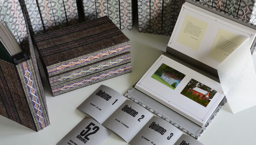 Bei meinem Künstlerbuch „52 Weeks“ ist das ganz klassisch mit einem Streifen aus Einbandgewebe gelöst. Zusammengehalten werden die Bogen von Messingbuchschrauben – wie bei einem Fotoalbum. Das Buch erzählt ein Jahr im Leben von zwei Brieffreundinnen. Eine lebt in Australien, die andere in Deutschland. Jede Doppelseite zeigt zwei Fotos und die dazugehörigen Texte – zwei Momente aus der gleichen Woche aber von entgegengesetzten Plätzen auf dieser Erde. Jeder der vier Bände enthält 13 Wochen, alle vier zusammen erzählen von einem Jahr im Leben zweier Menschen an Orten, die kaum weiter voneinander entfernt sein könnten.