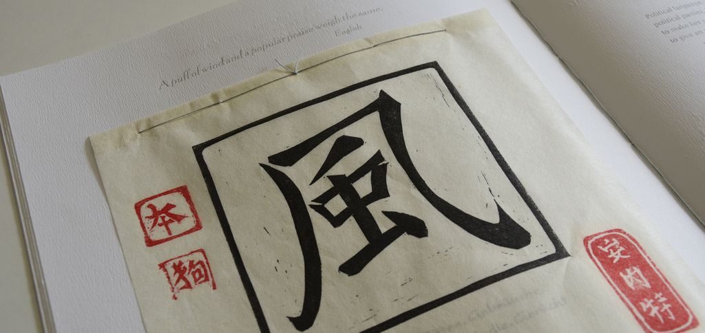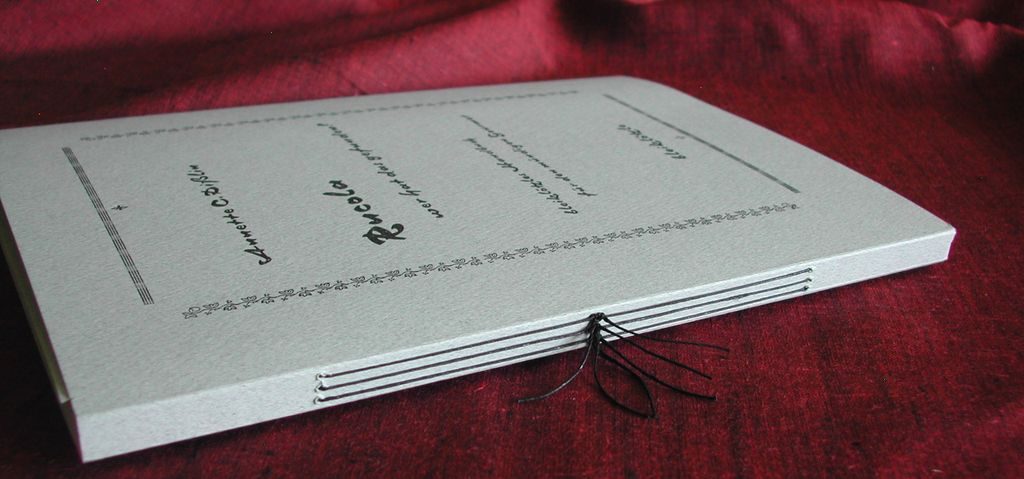 Das Gegenstück zur klebstofffreien Bindung ist die Bindung ohne Zwirn. Das kann interessant sein, wenn Illustrationen wie Original-Holzschnitte über die gesamte Doppelseite laufen. Bei einer Fadenheftung würde dann der Heftzwirn in der Mitte über der Illustration liegen und diese stören. Die im Englischen als „Stiff Leaf Binding“ bezeichnete Variante ist bei dem Künstlerbuch „Cumbria“ eingesetzt. Hier sind die Papierbogen vor dem Druck beidseitig mit Erdpigmentfarben eingefärbt worden. Darüber wurden dann Texte und Holzschnitte gedruckt.