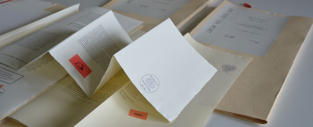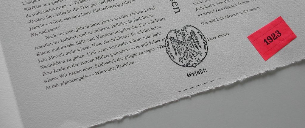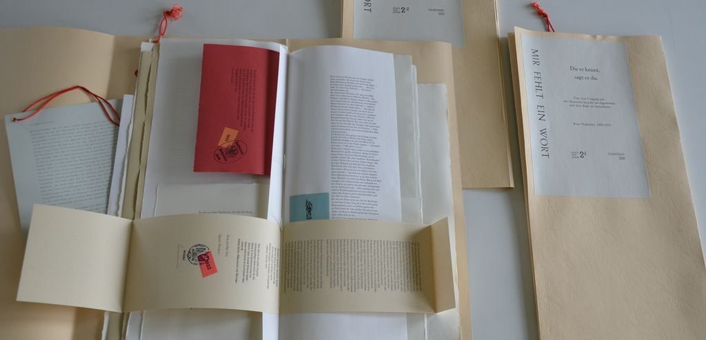 Für das Künstlerbuch zu Kurt Tucholsky mit dem Titel „Mir fehlt ein Wort“ war die Preußische Archivheftung die einzig richtige und geradezu ideal. Dem Buch liegt eine – fiktive – Geschichte zu Grunde, nach der ein junger Drucker in der Weimarer Zeit Abfallbogen mit interessanten Texten sammelt und sich zu Mappen heftet. Ein befreundeter Buchbinder hat ihm eben jene Heftweise erklärt. Sie geht gut und rasch zu machen – wenn man den Dreh erst raus hat. Nachdem der junge Drucker Deutschland Anfang 1933 überstürzt verlässt, fallen die Mappen der Partei in die Hände und werden damit zu Ermittlungsakten, um Kurt Tucholsky zum Landesverräter zu stempeln und ihm die deutsche Staatsangehörigkeit zu entziehen – was dann im August 1933 auch erfolgt.