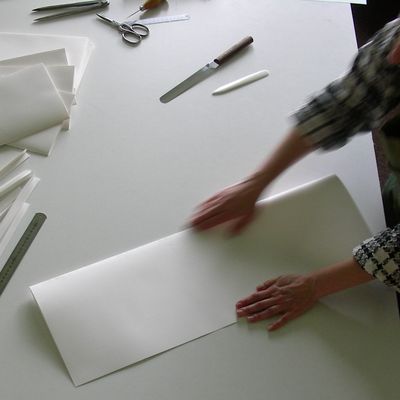Falzen der Papierbogen zu Lagen Heften auf der Heftlade Walnussblatt in Seidenpapier Künstlerbuch “Das Nußzweiglein“ Gefalzte Lagen, Buchblock, Buch