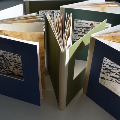Das Gegenstück zur klebstofffreien Bindung ist die Bindung ohne Zwirn. Das kann interessant sein, wenn Illustrationen wie Original-Holzschnitte über die gesamte Doppelseite laufen. Bei einer Fadenheftung würde dann der Heftzwirn in der Mitte über der Illustration liegen und diese stören. Die im Englischen als „Stiff Leaf Binding“ bezeichnete Variante ist bei dem Künstlerbuch „Cumbria“ eingesetzt. Hier sind die Papierbogen vor dem Druck beidseitig mit Erdpigmentfarben eingefärbt worden. Darüber wurden dann Texte und Holzschnitte gedruckt.