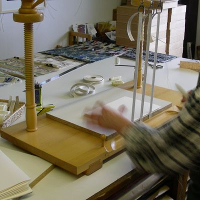 Der erste Standort meines Ateliers war nur ein paar Kilometer entfernt von Stuttgart. Dort gab es seinerzeit im Stadtteil Bad-Cannstadt das Buchbinder-Colleg. Es war eine Einrichtung der Buchbinder-Innung und wohnte sozusagen in einer alten Villa. Meister und Meisterinnen unterrichteten dort Auszubildende des Buchbinderhandwerks. Zum Programm gehörten aber auch Kurse für einen größeren Interessentenkreis. Ich habe verschiedene Kurse dort besucht. Wir haben spezielle Buntpapiere gemacht, Tuschen und Tinten angemischt wie in alten Zeiten, uns in historische Hefttechniken vertieft, mit experimentellen Heftechniken gespielt und wir haben die zarten Japanheftungen kennen gelernt.
