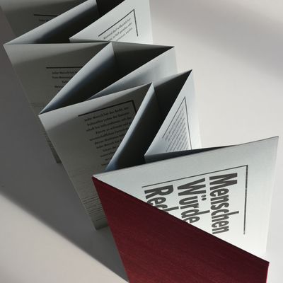 Für das Werk „Menschen.Würde.Rechte“ habe ich mit dem Prinzip der Zickzackfaltung, dem Leporello, experimentiert. Entstanden ist ein Zwillings-Leporellobuch mit eigener Dynamik. Der Einband: rote Wildseide – die Farbe der obersten Richter. Der Inhalt ist eine Auswahl von Artikeln aus der Erklärung der Menschenrechte. Das Buch kann endlos im Kreis geblättert werden, was die dauerhafte Gültigkeit der Menschenrechte zum Ausdruck bringen will.