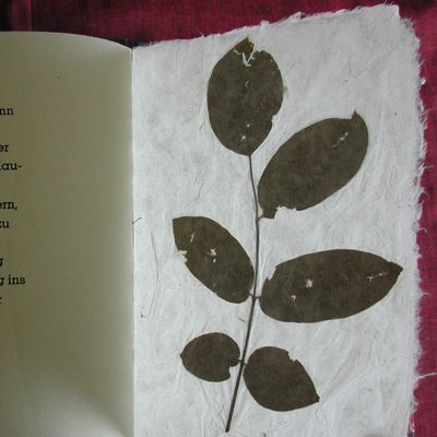 Ist alles gefalzt, werden die Lagen in der Buchbinderpresse eingepresst, danach kann geheftet werden, zum Beispiel auf der Heftlade. Das Ergebis ist der Buchblock, der dann, nach einigen weiteren Handgriffen, in die separat gefertigte Buchdecke eingehängt wird. Bei dem Werk „Das Nußzweiglein“ wurden zusätzlich Nussblätter eingearbeitet. Die Blätter wurden zunächst sauber gepresst in einer Herbarpresse. Danach wurden sie in Seidenpapier eingebettet und diese Bogen in den Buchblock mit eingeheftet.