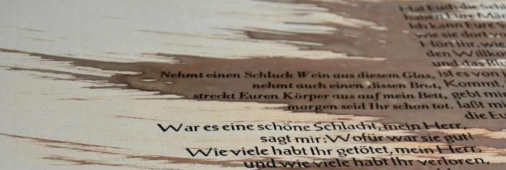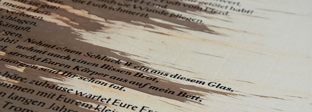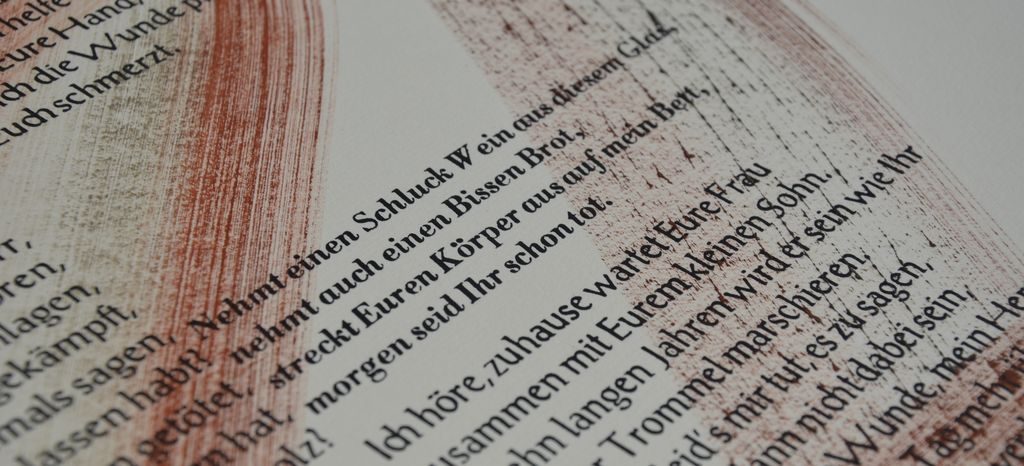 Mit dem Song „Did you like the Battle, Sir?“ verhält es sich ganz anders. Er erzählt von der Sinnlosigkeit des Krieges, dem Leid und dem Sterben für ein fragwürdiges Ziel. Das illustrative Element kommt hier von den Farben, die aus Erdpigmenten angerieben sind. Es sind die Farbtöne von aufgewühltem Schlamm und Blut, kombiniert aus roten Ockern und dunklen Umbratönen. Von diesem Einbalttdruck gibt es zwei Varianten: einige Bogen des schweren Büttenpapieres wurden vor dem Druckprozess eingefärbt, und der Text wurde dann auf diese Untermalung gedruckt. Für die andere Variante wurde der Text erst auf unbemaltes Bütten gedruckt und nachträglich übermalt.