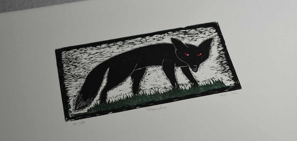 Der Song über den Fuchs, der einer klassischen Fuchsjagd eine unerwartete Wendung gibt und Meute wie Reitern das Fürchten lehrt, war von Anfang an mein Favorit. Für den Farbholzschnitt dazu habe ich drei Druckstöcke geschnitten. Eine Freundin absolvierte damals gerade eine Ausbildung zur Tischlerin. Ihr Ausbildungsbetrieb war damit beschäftigt, Handläufe aus Buchenholz in einem großen Treppenhaus einer Schule zu fertigen. Von den Reststücken, den für alles zu kurzen Abschnitten, konnte ich einen Korb voll kriegen – der Rest wurde im Werkstattofen der Tischlerei verheizt. Die Stärke der Holzstücke ist etwas geringer als die Druckhöhe in der Andruckpresse – also perfekt. Die Feinjustierung der Höhe eines Druckstockes erfolgt ohnehin mit unterlegten Papierbogen. Der kleine schwarze Fuchs mit dem pfiffigen Blick war sofort „Everybody‘s Darling“. Also habe ich den vielen Bitten nachgegeben und den Fuchs auch noch als reine Druckgraphik, also ohne den zugehörigen Text, gedruckt. Eigentlich wird dann nicht klar, weshalb er schwarz ist und rote Augen hat. Aber sein Charme hat alles wettgemacht.