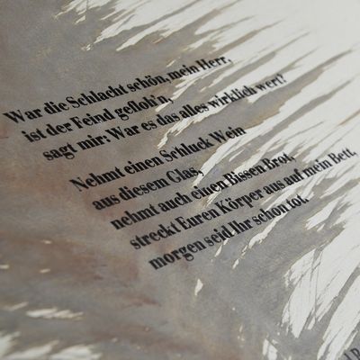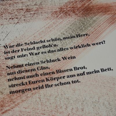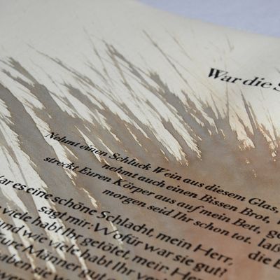Mit dem Song „Did you like the Battle, Sir?“ verhält es sich ganz anders. Er erzählt von der Sinnlosigkeit des Krieges, dem Leid und dem Sterben für ein fragwürdiges Ziel. Das illustrative Element kommt hier von den Farben, die aus Erdpigmenten angerieben sind. Es sind die Farbtöne von aufgewühltem Schlamm und Blut, kombiniert aus roten Ockern und dunklen Umbratönen. Von diesem Einbalttdruck gibt es zwei Varianten: einige Bogen des schweren Büttenpapieres wurden vor dem Druckprozess eingefärbt, und der Text wurde dann auf diese Untermalung gedruckt. Für die andere Variante wurde der Text erst auf unbemaltes Bütten gedruckt und nachträglich übermalt.
