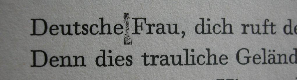 Wer Bücher aus Buchdruck- und Bleisatzzeiten aufmerksam anschaut, der wird immer mal wieder Fehler finden. Manche Werke sind auch sozusagen mit schneller Letter gedruckt, will heißen rasch und billig produziert, und haben ein recht unsauberes Druckbild. Und hin und wieder findet man so schöne Phänomene wie Spieße, etwas, das in Offset- oder Digitaldruckzeiten gar nicht mehr vorkommen kann. Spieße gehören in der Regel zu den echten Druckfehlern, denn sie hat normalerweise der Drucker zu verantworten, weil die Druckform in der Druckpresse nicht ordentlich geschlossen, also fest genug eingespannt war. Vor allem beim Druck mit Zylinderpressen und ganz besonders bei maschinellen Pressen, wie den Schnellpressen für den Druck großer Auflagen, rütteln die Vibrationen währed des Druckprozesses an der Druckform. Durch diese Vibrationen arbeiten sich Teile des Blindmaterials, die zu locker sitzen, allmählich nach oben und, sobald sie Druckhöhe erreichen, nehmen sie Farbe an und drucken sich als rechteckige Marken zwischen die Wörter, genau da, wo eigentlich ein Wortzwischenraum sein sollte. An dieser Stelle ist das Blindmaterial also nicht blind geblieben, sondern hat sich selbst als schwarzen Balken sichtbar gemacht.