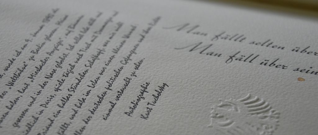 Im Jahr 2010 habe ich, anlässlich des 75. Todestages von Kurt Tucholsky, das Künstlerbuch „Mir fehlt ein Wort“ mit über 60 Texten des bekannten Journalisten vorgestellt. Dem Werk liegt die Geschichte des jungen Buchdruckers Wilhelm Klemper zu Grunde, in der Makulaturen eine zentrale Rolle spielen. Wilhelm fand Arbeit in einer Berliner Druckerei in den Jahren der Weimarer Republik. Er sammelte Makulaturbogen mit Texten, die er interessant fand – viele davon von Kurt Tucholsky. Ein befreundeter Buchbinder zeigte ihm dann, wie er diese losen Bogen schnell zusammenheften konnte. So entstanden drei Mappen in preußischer Archivheftung.