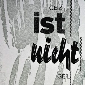Markus Marder: Geiz ist nicht geil Handsatz aus der Futura und anderen Schriften, Buchdruck, Linolätzung, Irisdruck, 250 g Rives Tradition silbergrau, 22 x 30 cmLimitierte Auflage. Euro 8,00 Das Künstlerbuch „Quod tibi hoc…