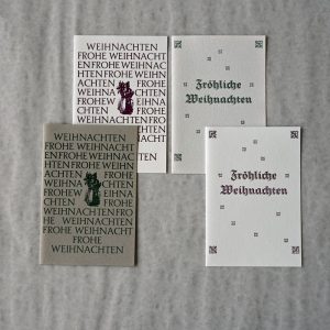 Die Motive dieser Karten sind im Handsatz gesetzt aus Bleilettern und weihnachtlichen Ornamenten. Die Karten sind von Hand auf einer historischen Pappschere zugeschnitten und von Hand gefalzt. Limitierte Auflage. Frohe WeihnachtenSchrift: Titula, mit…