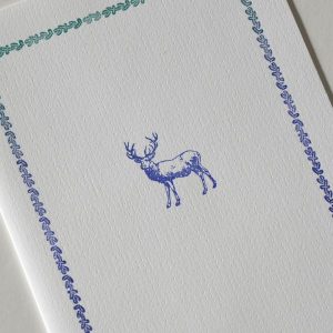Klappkarte auf weißem, strukturierten Designpapier. Die Karte zeigt einen Hirsch eingerahmt von klassischem Weihnachtsschmuck in der Form von Tannenzweigen – alles ist von Hand aus Bleisatzmaterial gesetzt. Gedruckt wurde im Irisdruck, der auf…