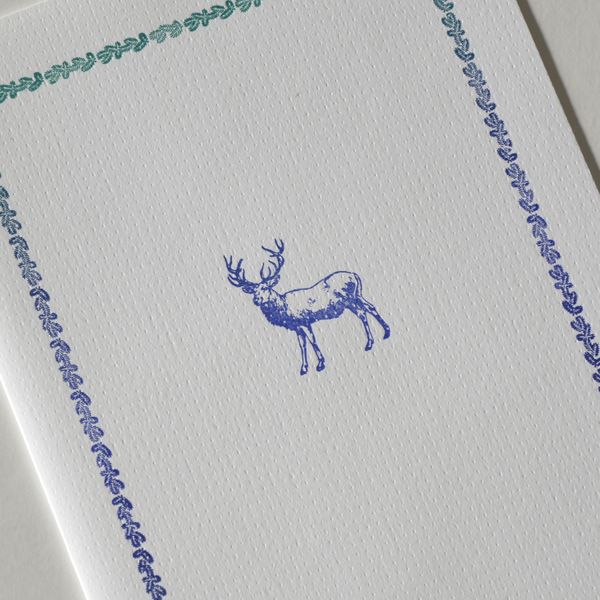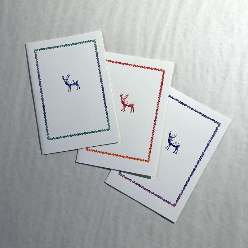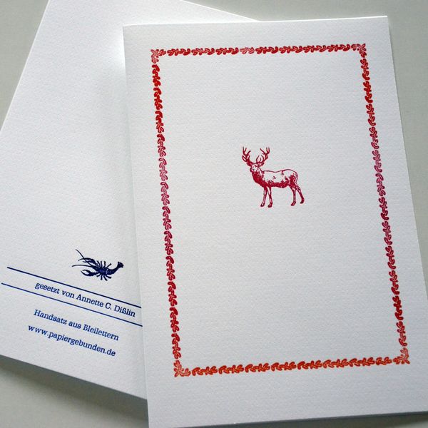 Klappkarte auf weißem, strukturierten Designpapier. Die Karte zeigt einen Hirsch eingerahmt von klassischem Weihnachtsschmuck in der Form von Tannenzweigen – alles ist von Hand aus Bleisatzmaterial gesetzt.