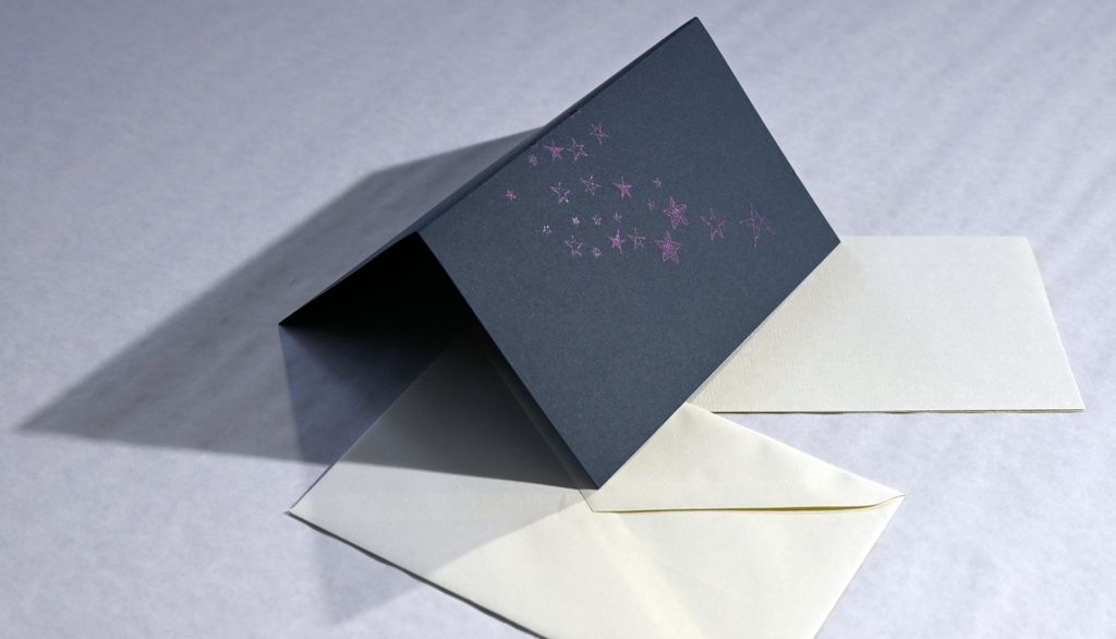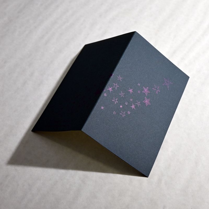 Die Klappkarte ist auf sehr festen nachtblauen Karton gedruckt. Verwendet wurden verschiedene Stern-Ornamente. Gedruckt ist in einem Violett-Ton, dem etwas Silberfarbe beigemischt wurde. Die Sterne leuchten je nach Einfallswinkel auf oder verschwinden scheinbar wieder – wie am Nachthimmel.