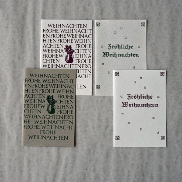 Die Motive dieser Karten sind im Handsatz gesetzt aus Bleilettern und weihnachtlichen Ornamenten. Die Karten sind von Hand auf einer historischen Pappschere zugeschnitten und von Hand gefalzt. Limitierte Auflage.