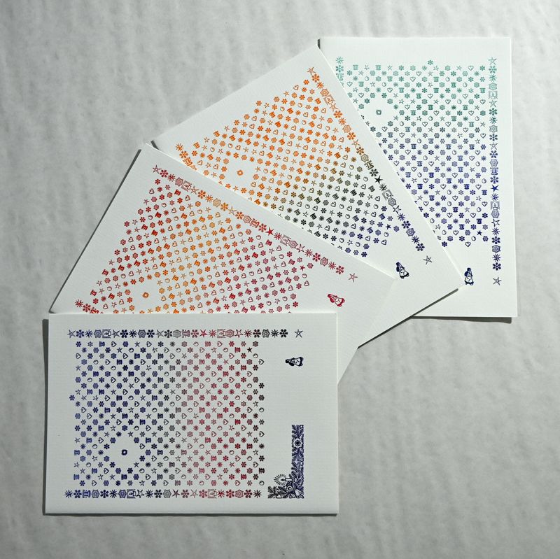 Gedruckt wurde im Irisdruck, der auf jeder Karte einen etwas anderen Farbverlauf ergibt. Vier Farbvarianten sind umgesetzt: Blau-Rot, Rot-Orange, Orange-Grün-Blau und Grün-Blau.