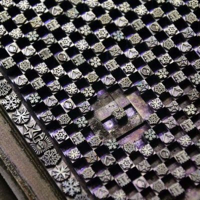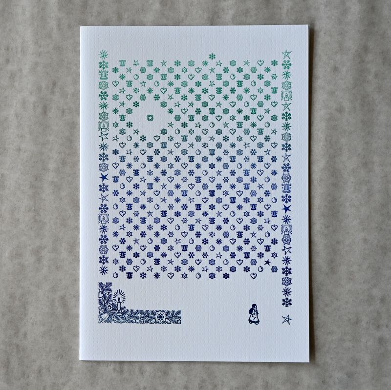 Klappkarte auf weißem, strukturierten Designpapier. Das Motiv ist gestaltet mit den klassischen Weihnachtsschmuckelementen, wie sie zu Bleisatzzeiten in Verwendung waren und von Hand gesetzt.
