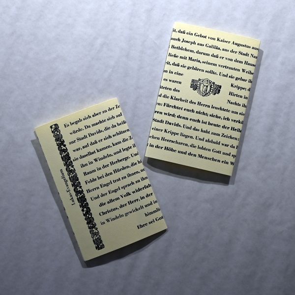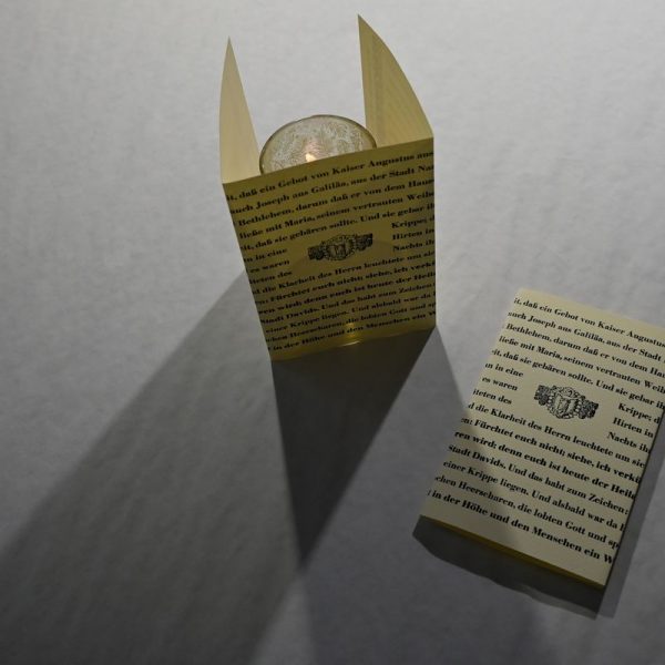 Die Weihnachtsgeschichte aus dem Lukas-Evangelium: gedruckt auf feinem, chamoisfarbenen Karton mit zarter Struktur. Die Klappkarte hat 6 Seiten und kann um ein Licht herum aufgestellt werden – so wird das Jesuskind von hinten erleuchtet.