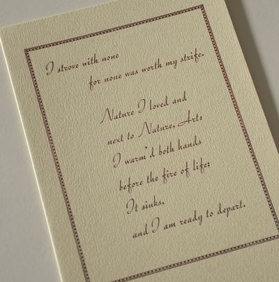 Walter Savage Landor ist 1775 geboren in Isley Court und 1864 gestorben in Florenz. Sein Gedicht “Finis” ist hier von Hand gesetzt aus der Quick und in Braun auf zwei Papiervarianten gedruckt. Das…