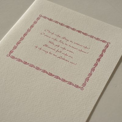 Friedrich Rückerts (1789-1866) Gedicht ist von Hand gesetzt aus der Bernhard Schönschrift und in zwei Varianten gedruckt.Variante 1:auf strukturiertes, weißes Designpapier in Rot gedrucktVariante 2:auf strukturiertes, weißes Designpapier in Blau gedruckt Klappkarte im…