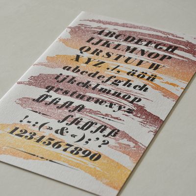 Klappkarte im Format A5 aus strukturiertem Designpapier (250 g) mit passendem Umschlag. Handsatz aus Bleilettern. Limitierte Auflage. Schrift: Fette Bodoni kursivJahrgang: 1931Schriftdesign: Edmund Thiele 1872-1953Druck der Schrift: schwarzVariante 1:weißes DesignpapierHintergrund: Farbverlauf rot-orange von…